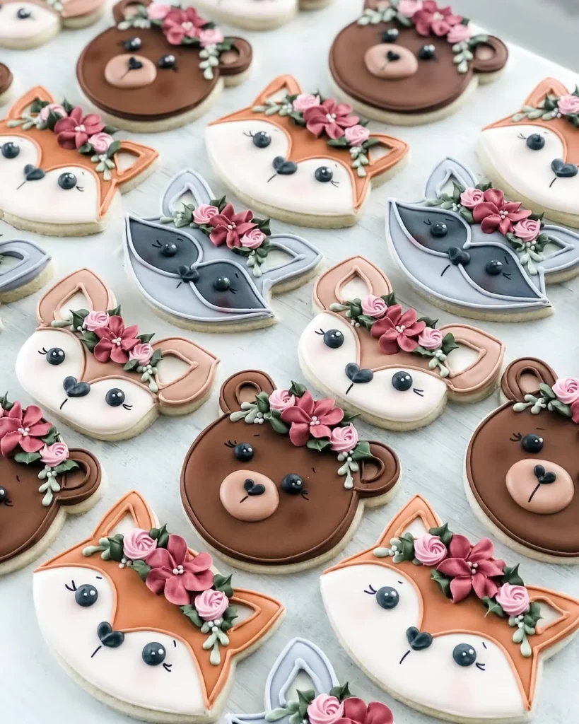 These woodland friends cookies bring a sweet, playful touch to any Thanksgiving dessert table. Each cookie features an adorable animal face, from foxes and bears to raccoons and deer, all decorated with soft icing and floral crowns.