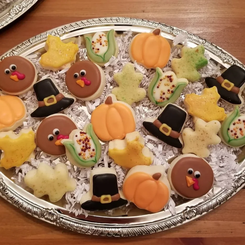 This tray of Thanksgiving-themed mini cookies brings a joyful mix of autumn colors and playful shapes. Each cookie adds its own charm, from the smiling turkeys to the tiny pumpkins that look warm and inviting. The black pilgrim hats add a classic holiday touch, while the corn-shaped cookies decorated with colorful sprinkles bring a fun pop of texture.