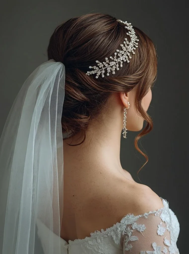 Adorned with a delicate jeweled headpiece, this hairstyle strikes the perfect balance between chic and romantic. It’s an excellent option for brides who want a polished style that showcases their face and neckline beautifully.