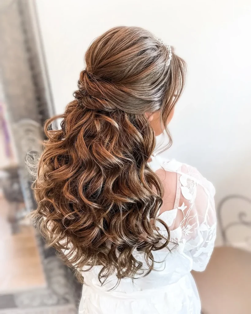 Styling Tip: Use a large curling wand for big, bouncy curls, then gently tease the crown for added volume. Secure the half-up section with hidden pins and finish with a shine-enhancing hairspray. Add a delicate hairpiece or crystal comb to elevate the bridal charm.