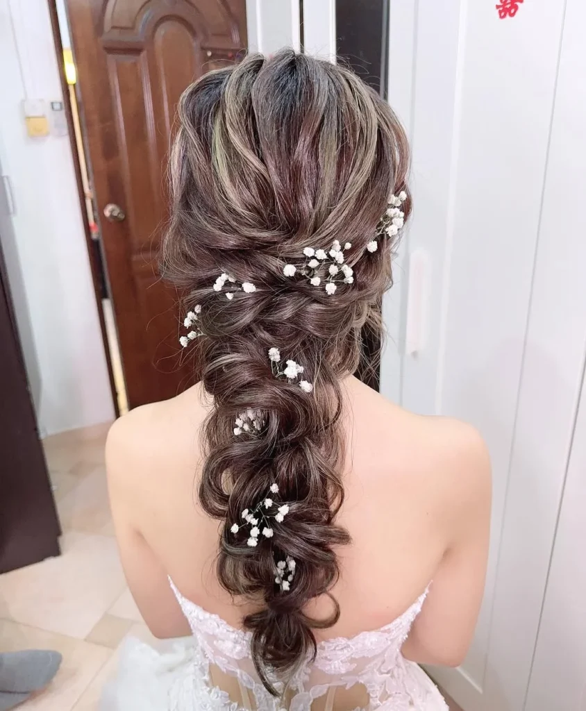 Styling Tip: Start with loose curls for movement, then braid softly while pulling sections for volume. Finish with baby’s breath accents and a light mist of setting spray to keep your braid secure yet natural throughout the celebration.