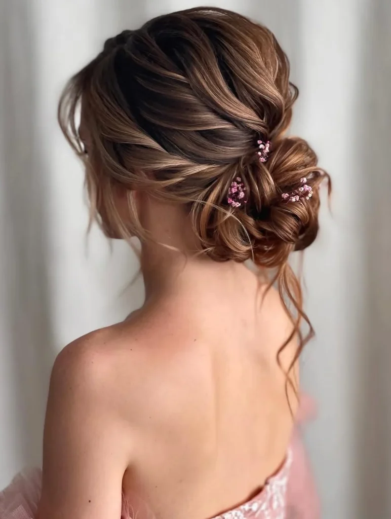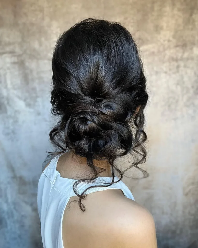 Styling Tip: Start by curling your hair with a medium wand for added texture, then twist sections loosely into a low bun. Leave a few strands out for softness and secure with bobby pins. Finish with a light mist of hairspray to hold everything in place, and tuck in small floral pins or pearl accents for a romantic finishing detail.