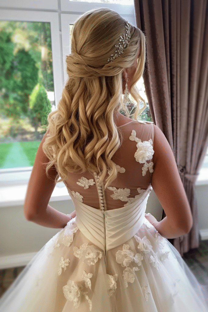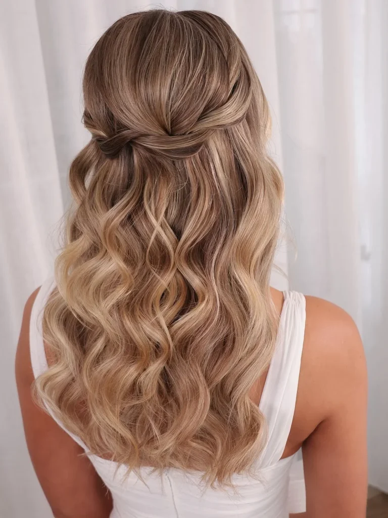 For brides who adore soft romance, this half-up twisted hairstyle is pure elegance. Gentle waves cascade down the back, creating movement and depth, while the twisted sections add a subtle yet graceful detail. The look balances structure and flow, making it a lovely choice for garden, beach, or rustic weddings.