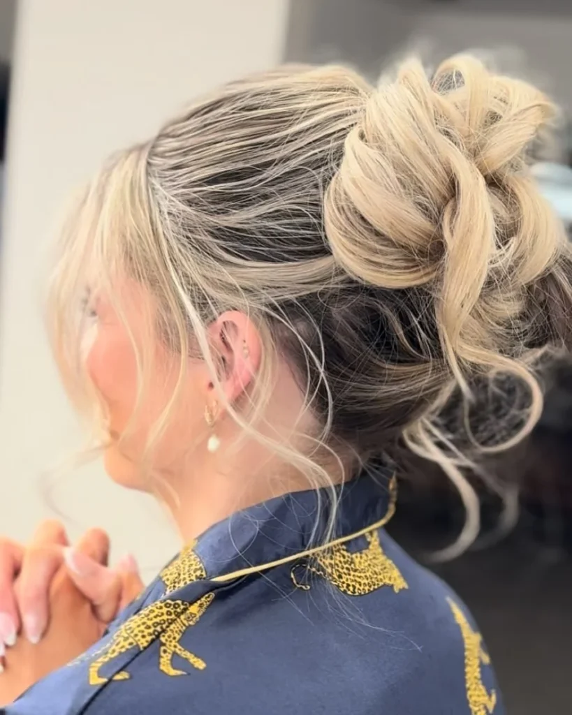 Styling Tip: Begin by curling your hair with a medium wand to build texture. Gently tease the crown for volume, then twist and pin sections loosely at the nape. Let a few strands fall naturally for softness. Finish with a light mist of flexible-hold hairspray to maintain shape without stiffness. Add a jeweled pin or pearl accessory for an extra hint of bridal glamour.
