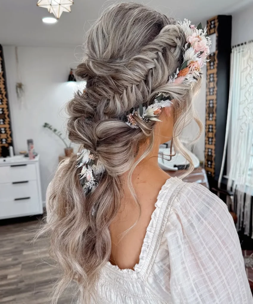 Styling Tip: Begin by adding soft curls to your hair for volume and texture. Create a loose fishtail braid, gently pulling apart sections for a fuller, airy effect. Finish by tucking in dried or fresh blooms throughout the braid, securing them with small pins. Use a light-hold hairspray to maintain movement while keeping the flowers intact all day.