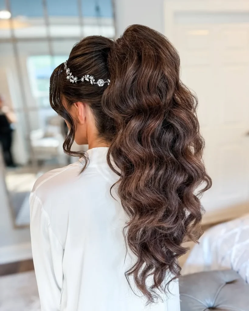 For brides seeking a modern yet glamorous look, this voluminous bridal ponytail is a stunning choice. The cascading waves create a luxurious sense of movement, while the height at the crown adds sophistication and drama.