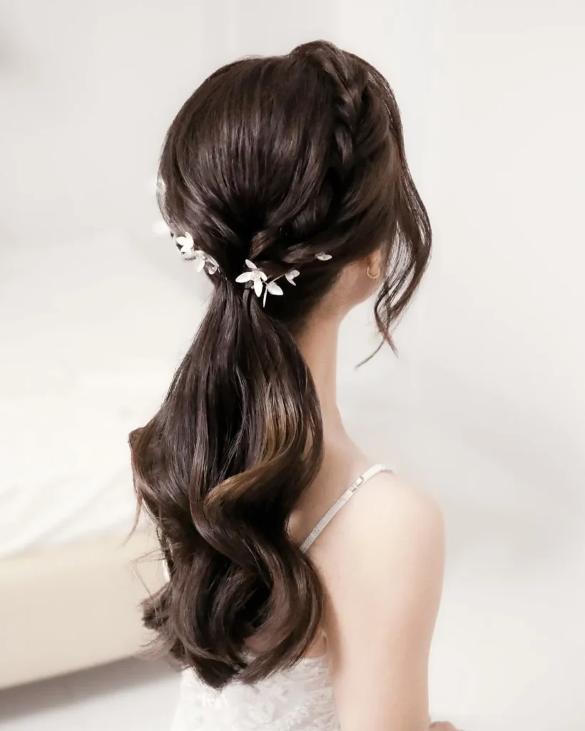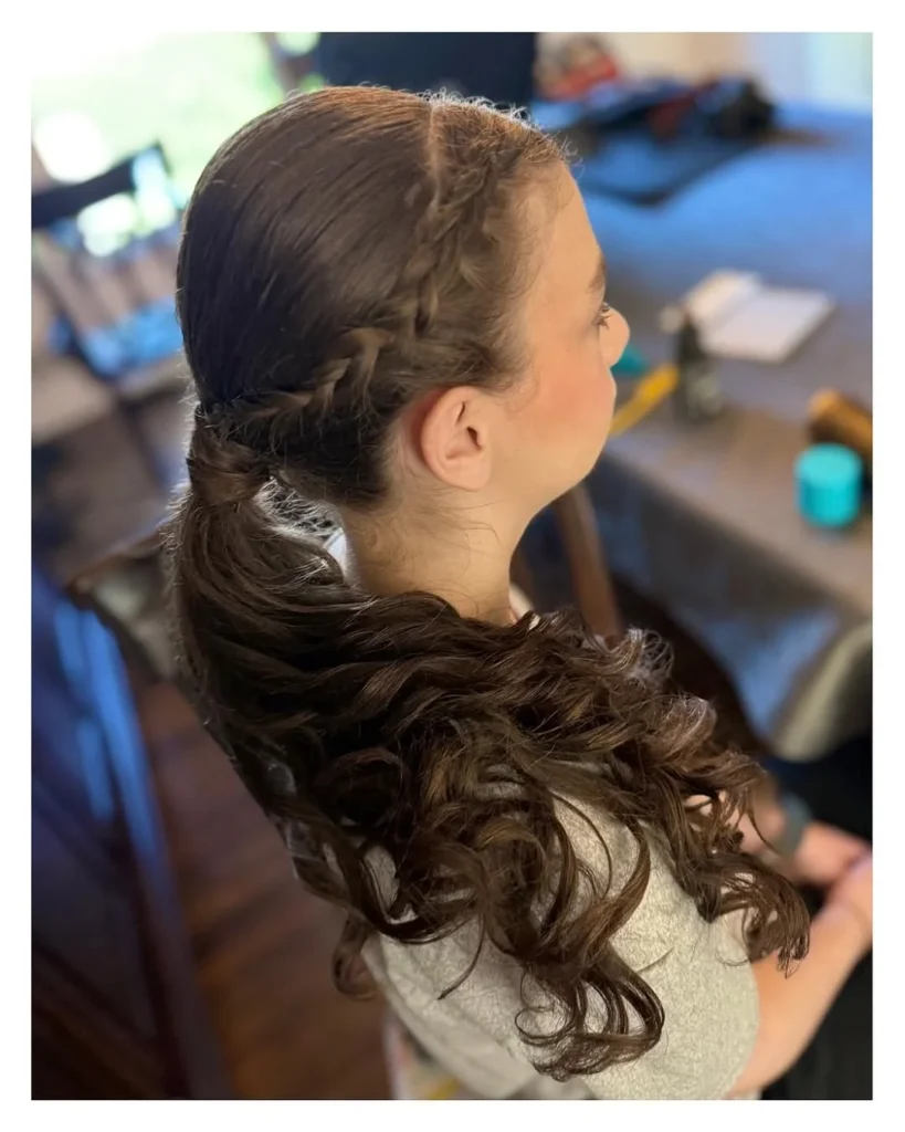 For brides or bridesmaids who love a youthful and elegant style, this braided side ponytail is a lovely choice. A delicate braid frames the side, flowing seamlessly into a voluminous ponytail of soft, defined curls.
