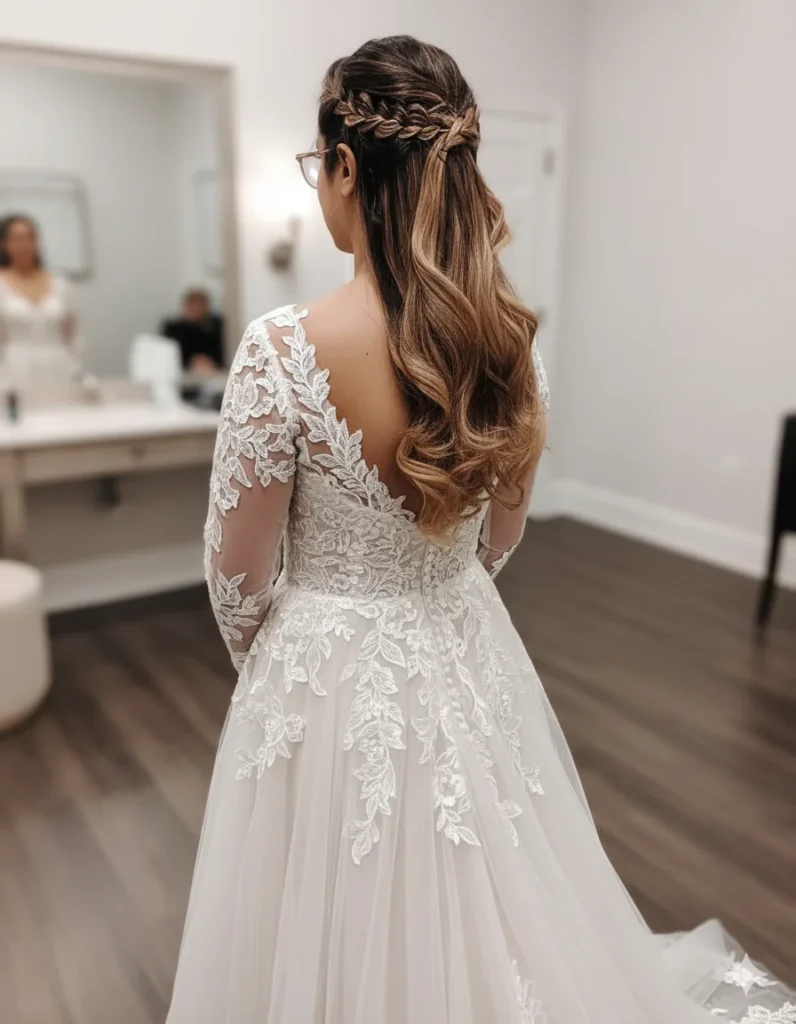 - V-neck or plunging gowns: Side-swept curls or half-up styles draw attention to your neckline.