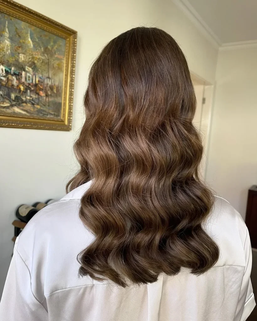 For brides who love timeless glamour, these classic Hollywood waves radiate sophistication and grace. The smooth, sculpted curls flow seamlessly down the back, reflecting light with a soft sheen that feels both vintage and modern.