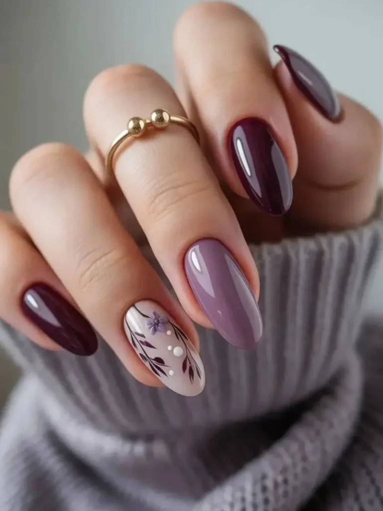 The rich color scheme makes it versatile for any occasion, whether it’s a casual outing or a special event. The soft floral details evoke a sense of calm and beauty, while the overall look feels timeless. This nail art will surely catch the eye with its understated elegance and chic appeal.