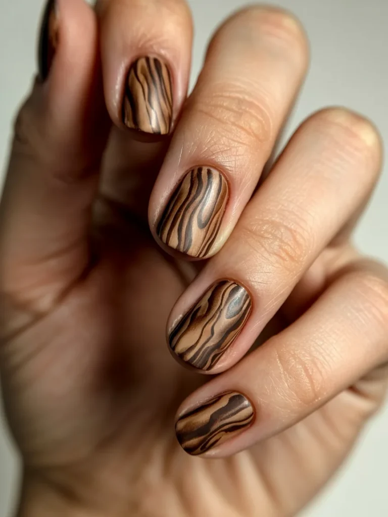 Perfect for those who love earthy tones, this style blends modern sophistication with a rustic charm. The muted colors and organic pattern evoke a sense of connection to nature, making it an excellent choice for anyone looking for a unique and trendy nail design that stands out while remaining classy. Whether you’re attending a special event or simply want to elevate your everyday style, these woodgrain-inspired nails offer a beautiful blend of beauty and simplicity.