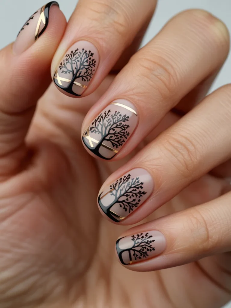 These nails feature a delicate yet bold tree design that adds an organic touch to a chic, contemporary look. The hand-painted black trees stand out against a soft nude base, bringing a sense of nature and balance to the manicure. The gold accents along the tips enhance the design, giving it an elegant finish. This nail art combines nature’s beauty with sophisticated lines, creating a perfect balance between rustic charm and modern aesthetics.