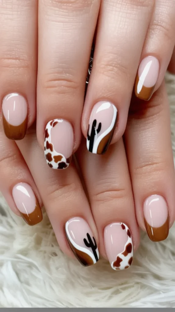 These nails bring a unique fusion of nature and artistic flair. The deep brown tones and geometric shapes recall the raw beauty of the desert, complemented by a fun giraffe print design on one nail. The cactus-inspired design on another adds a natural touch, while the creamy beige base enhances the sophisticated vibe.