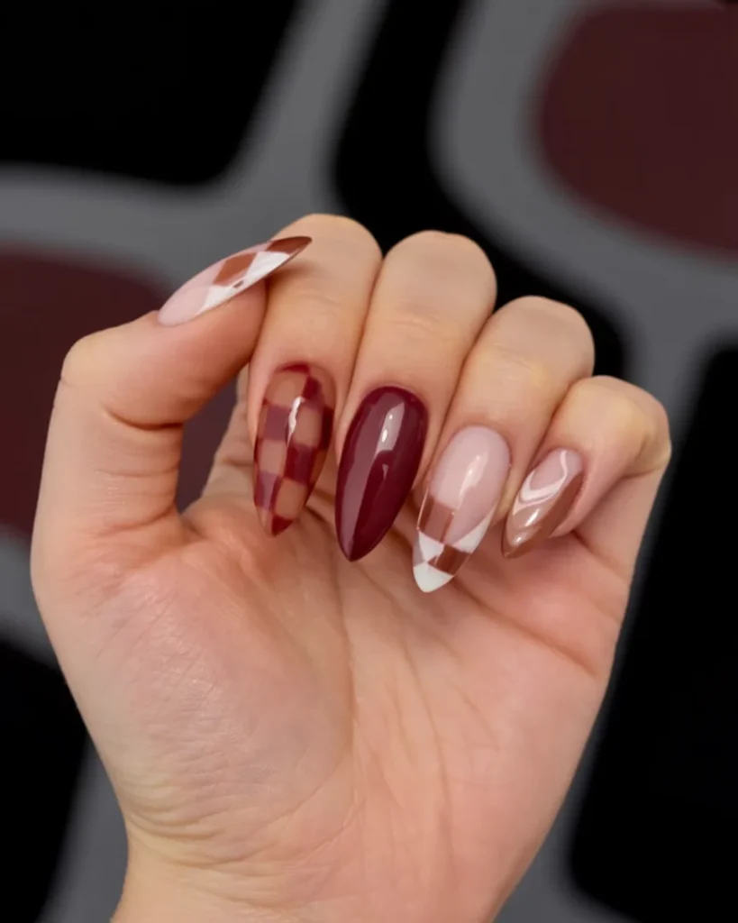 These nails exude sophistication with their mix of deep burgundy, soft beige, and bold checkerboard patterns. Each nail showcases a unique design that plays with geometric shapes, blending contemporary and classic elements. The sharp lines of the checkered design contrast beautifully with the rich tones of the glossy burgundy and soft nude nails, creating a stunning visual balance.