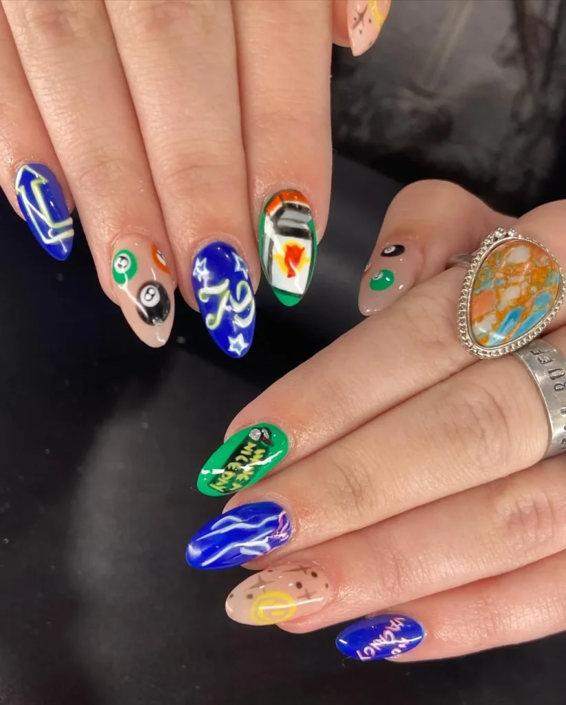 The combination of nail art techniques brings together the vibrancy of street style with a unique artistic flair, capturing attention with each movement. Whether it’s the 8-ball design, the swirling blue marble effect, or the graffiti-like fonts, these nails serve as a canvas for individuality. This design captures the spirit of modern creativity, perfect for those who enjoy making a statement.