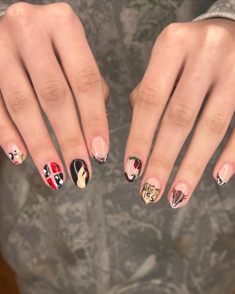 These nails capture the essence of creative expression, showcasing a bold mix of patterns and vivid colors. The combination of floral accents, geometric shapes, and free-spirited designs brings together modern art and nature. The black and red contrasts on some nails are complemented by intricate details like the road sign and rose design, creating a striking visual appeal. Each nail offers a unique touch, making this design stand out.
