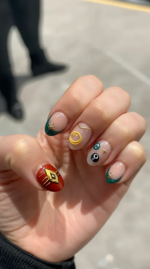This playful, boho-inspired Treaty Oak Revival nails design combines earthy tones and quirky details, bringing nature and creativity together beautifully. The deep green accents on the tips mimic the lush leaves of the oak tree, while the gold star and smiley face decals add a fun twist. The addition of the intricate geometric design on the red nail serves as a tribute to the tree’s ancient beauty, while small symbols like a leaf and crescent shape complement the overall aesthetic.