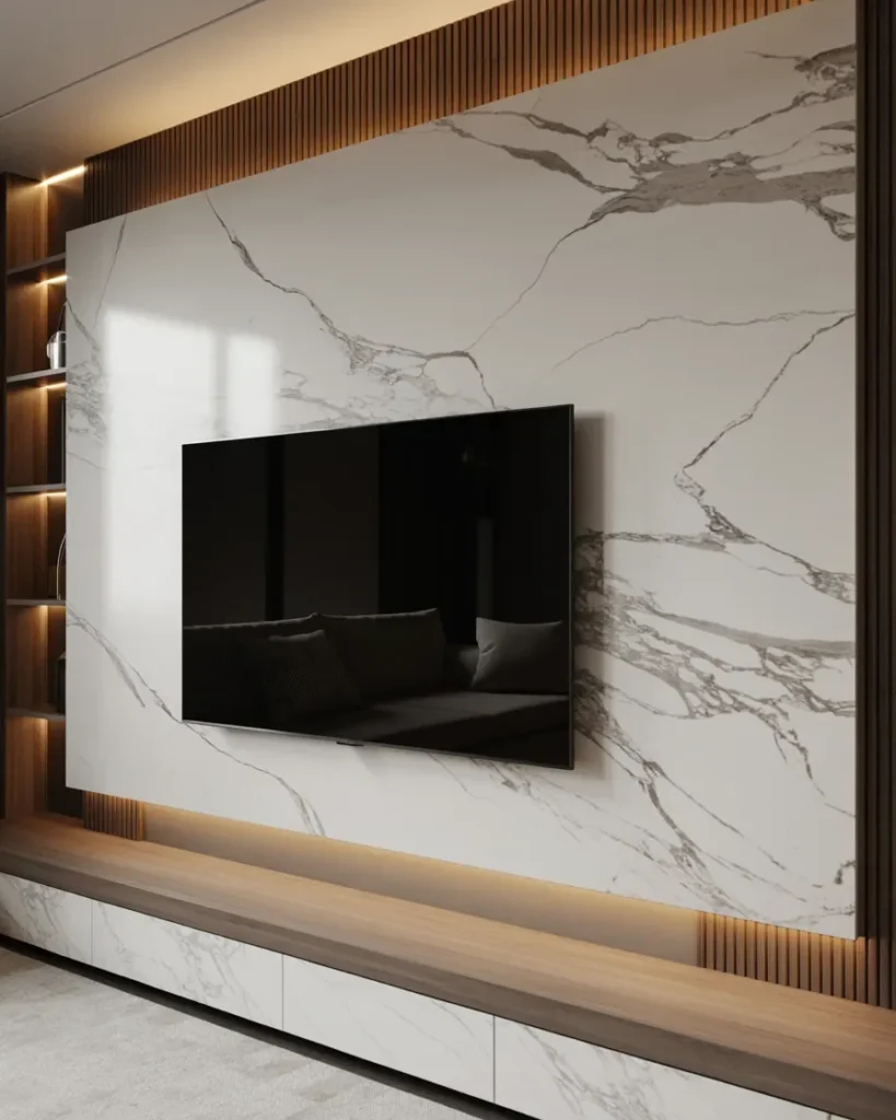 This luxury modern TV wall design uses a bold marble surface to bring depth and calm into the living space. Natural veining spreads softly across the wall, creating visual interest without pulling attention away from the screen.