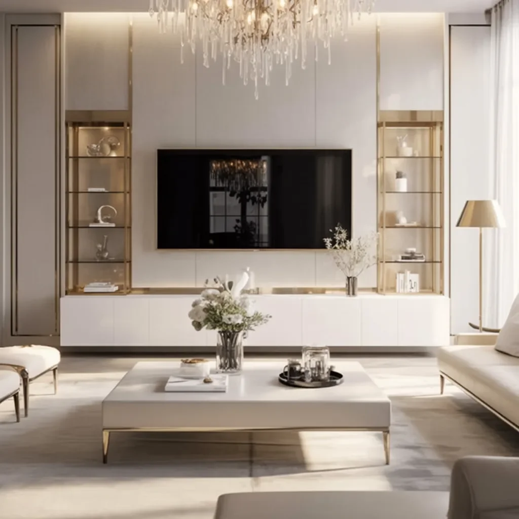 This luxury modern TV wall design creates a calm yet striking focal point through soft ivory panels and refined gold detailing. The balanced layout keeps the TV centered while allowing the surrounding materials to quietly elevate the space.