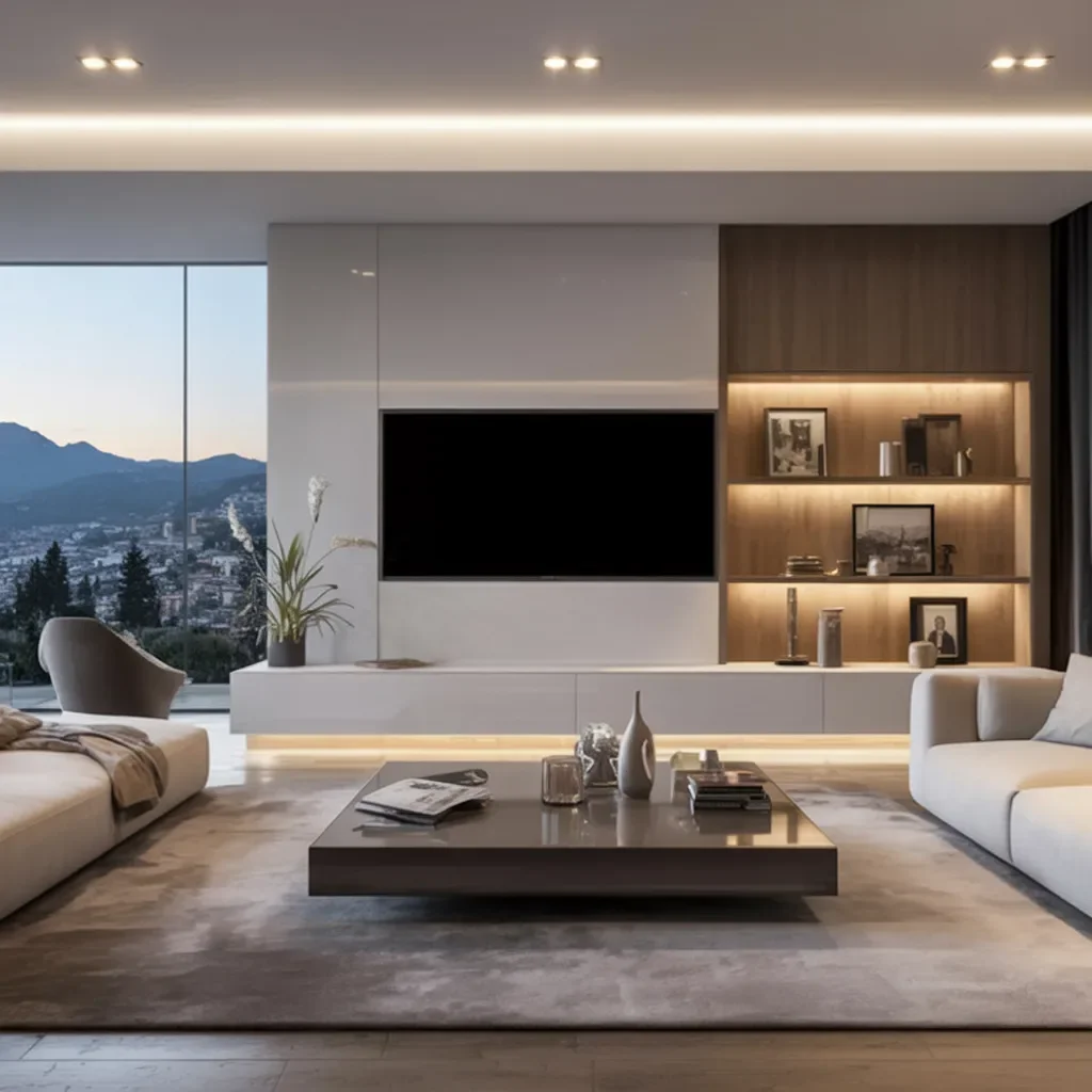 A clean floating TV wall anchors the room with a calm luxury modern look that feels open and balanced. Soft ceiling lights wash across the surface, creating a smooth glow that blends beautifully with the wide window view.