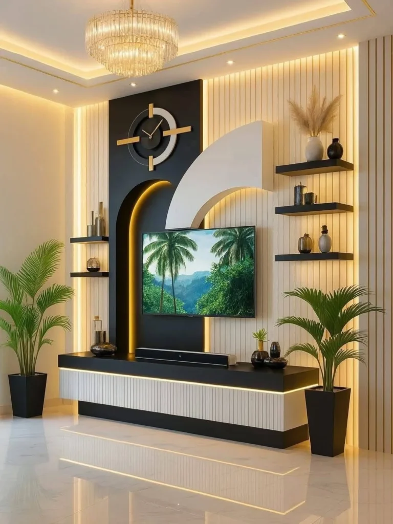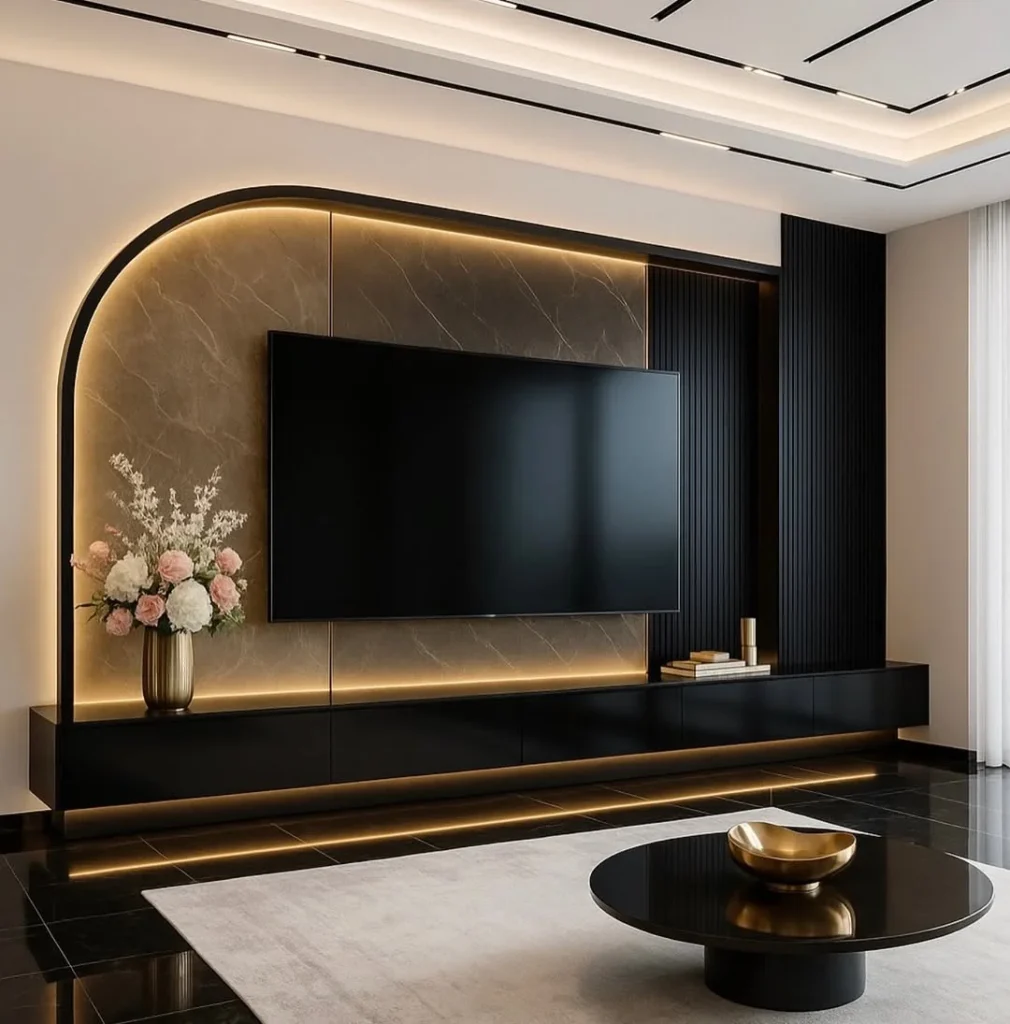 This TV wall design works beautifully in modern living rooms that value elegance with character. Among luxury modern TV wall design ideas, it stands out for its artistic form, thoughtful lighting, and balanced composition that feels refined, stylish, and comfortable for everyday living.