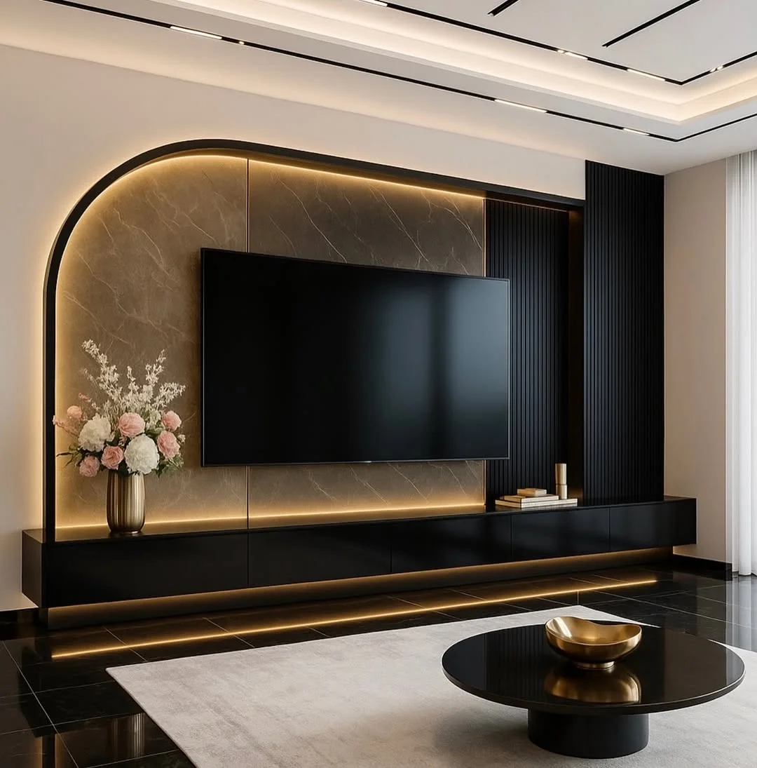 Soft curves define this luxury modern TV wall design, where an arched marble panel becomes the visual anchor of the space. Warm backlighting traces the shape gently, adding depth while keeping the mood calm and refined.