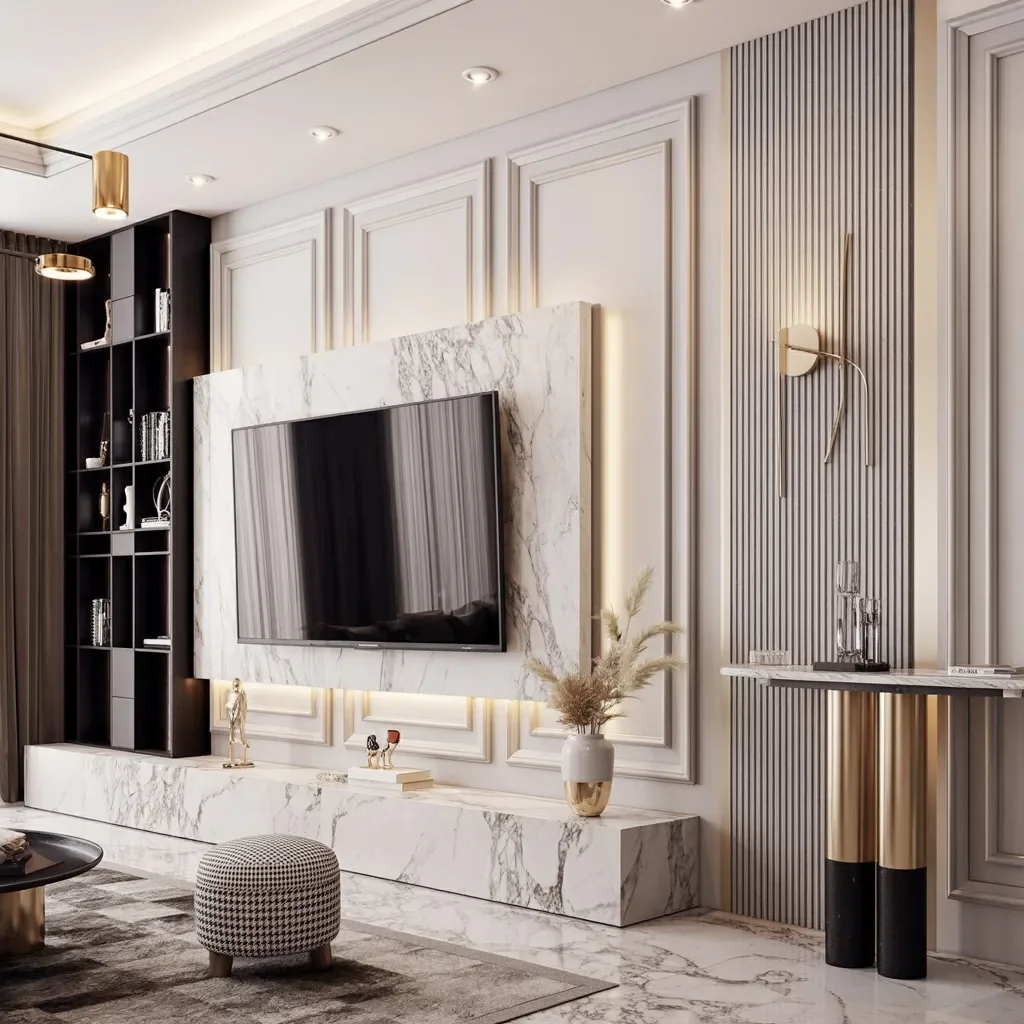 This luxury modern TV wall design blends classic wall paneling with a bold marble frame that instantly draws the eye. Soft neutral tones keep the space bright while the marble adds depth and a quiet sense of richness.