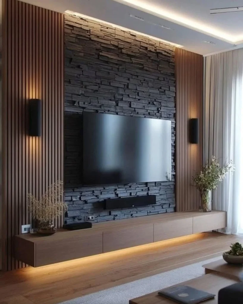 Dark vertical slats on one side introduce contrast and balance, helping the TV stand out without overpowering the wall. Natural stone texture brings quiet movement, making the surface feel rich and thoughtfully layered.