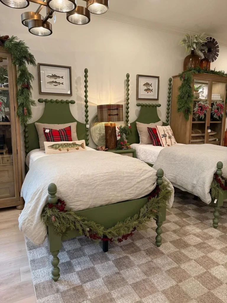 Warm green twin beds anchor this guest room with a cozy, lodge inspired feel that feels inviting and grounded. Natural wood tones, soft white bedding, and seasonal greenery create a space that feels calm yet full of character.