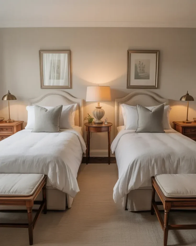 Careful symmetry brings balance to the room, with matching headboards, artwork, and lighting guiding the eye across the layout. This twin beds guest room idea works well for shared stays while still giving each guest their own defined space.
