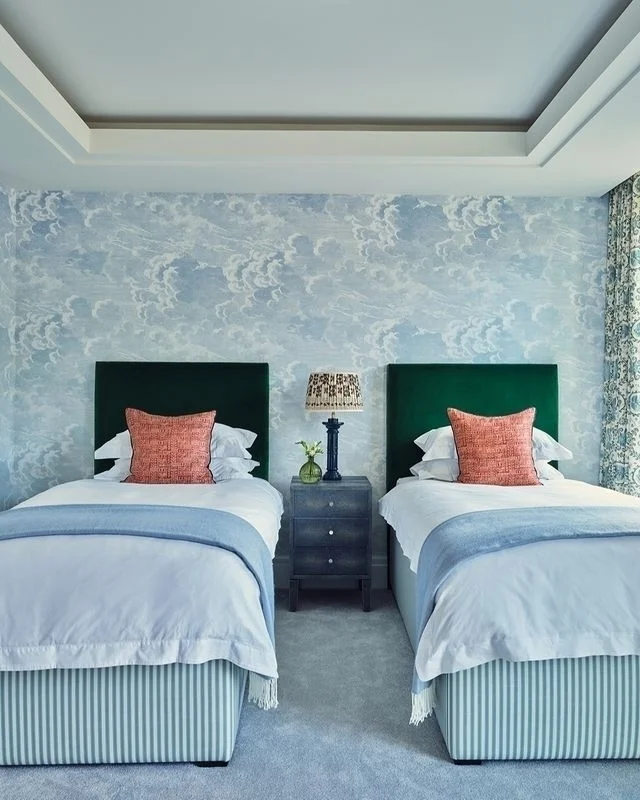 A calming blue palette defines this twin beds guest room idea, where patterned wallpaper adds depth without overwhelming the space. Gentle tones across the walls and bedding create a relaxed mood that feels welcoming from the first glance. Upholstered headboards bring structure while keeping the look soft and inviting.