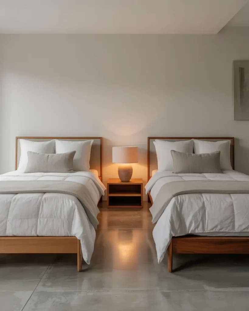 Soft neutral tones set a calm foundation in this twin beds guest room, allowing the space to feel open and thoughtfully arranged. Clean wooden bed frames paired with crisp white bedding bring a sense of order that feels welcoming rather than stiff. Natural light reflects gently off the smooth floor, helping the room stay bright throughout the day.