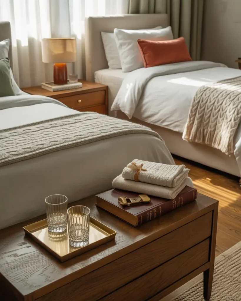 A shared wooden bench placed between the beds adds practical storage and thoughtful styling. Simple touches like neatly folded towels, stacked books, and water glasses signal care and attention that guests truly appreciate.