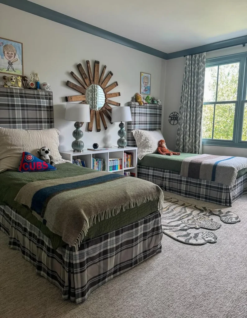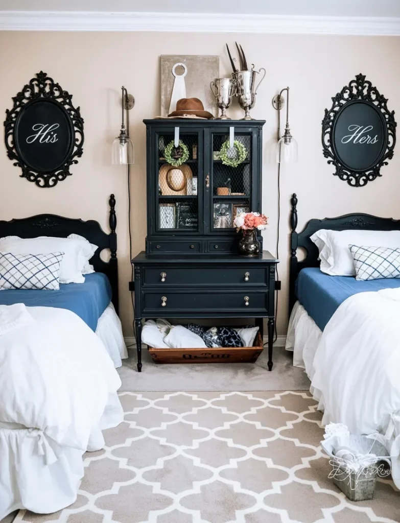 Between the beds, a vintage style dresser anchors the room while adding storage and visual interest. Decorative accents like wreaths, framed signs, and metallic trophies introduce character without making the space feel crowded.