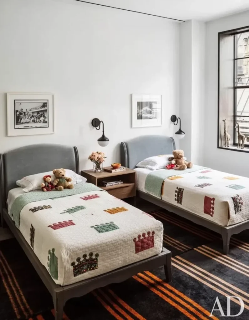 Color appears through patterned pillows and a woven rug that bring personality without crowding the room. Each twin bed is styled the same, which helps the layout feel balanced and thoughtful. Simple headboards keep the look clean while still offering comfort.