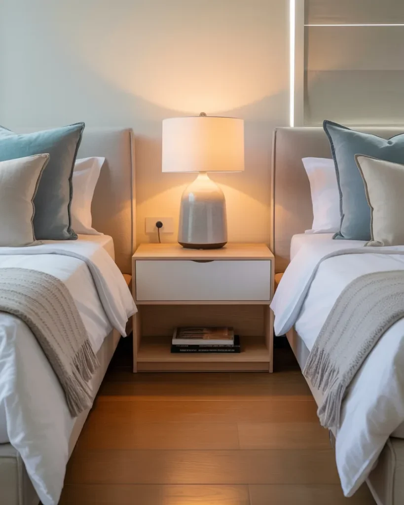 Between the beds, a shared nightstand adds function and visual connection. A classic table lamp provides soft lighting that works well for reading or winding down after a long day. Small greenery introduces a relaxed, lived in touch.
