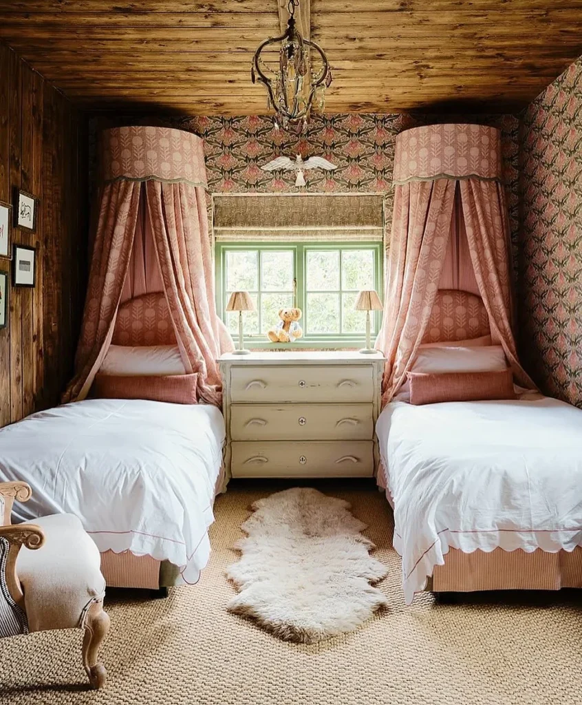 Warm wooden walls create an instant sense of calm, giving this twin beds guest room a cozy and lived in feeling that feels welcoming from the first glance. Soft pink canopy details frame each bed and add a gentle layer of charm without making the space feel heavy.