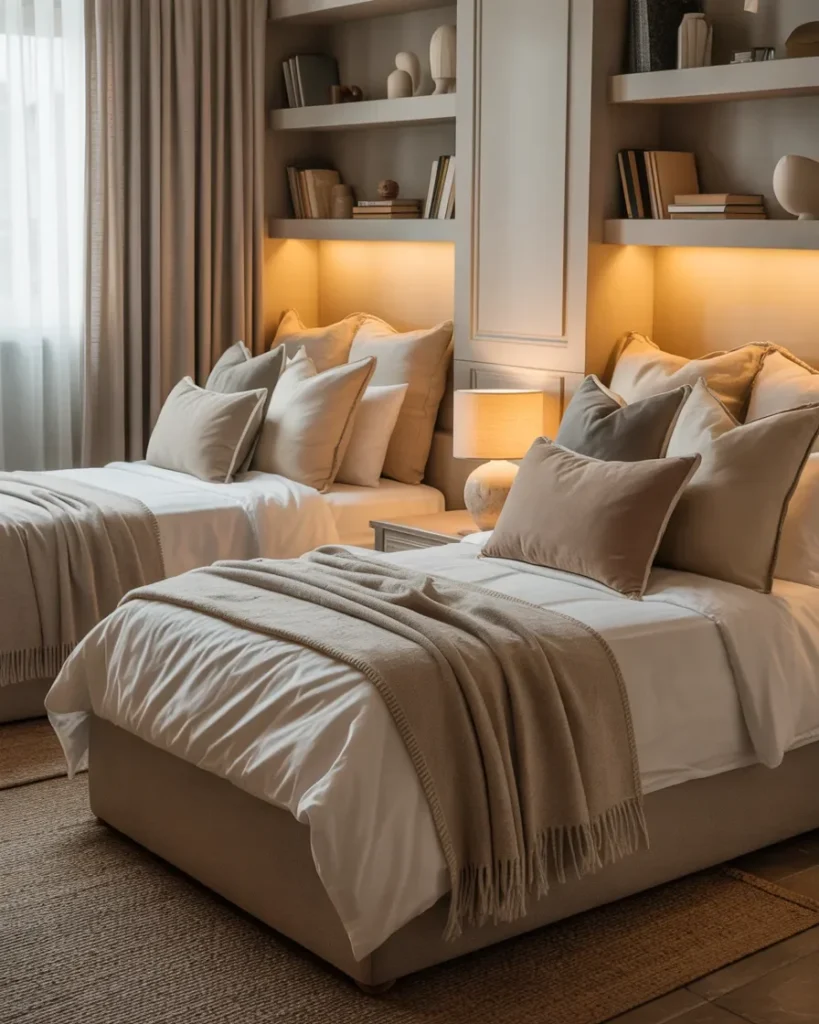 Careful layering of pillows, throws, and clean white bedding gives each twin bed its own presence while keeping the room visually connected. Subtle textures and warm fabrics help the space feel cozy without looking heavy or crowded.