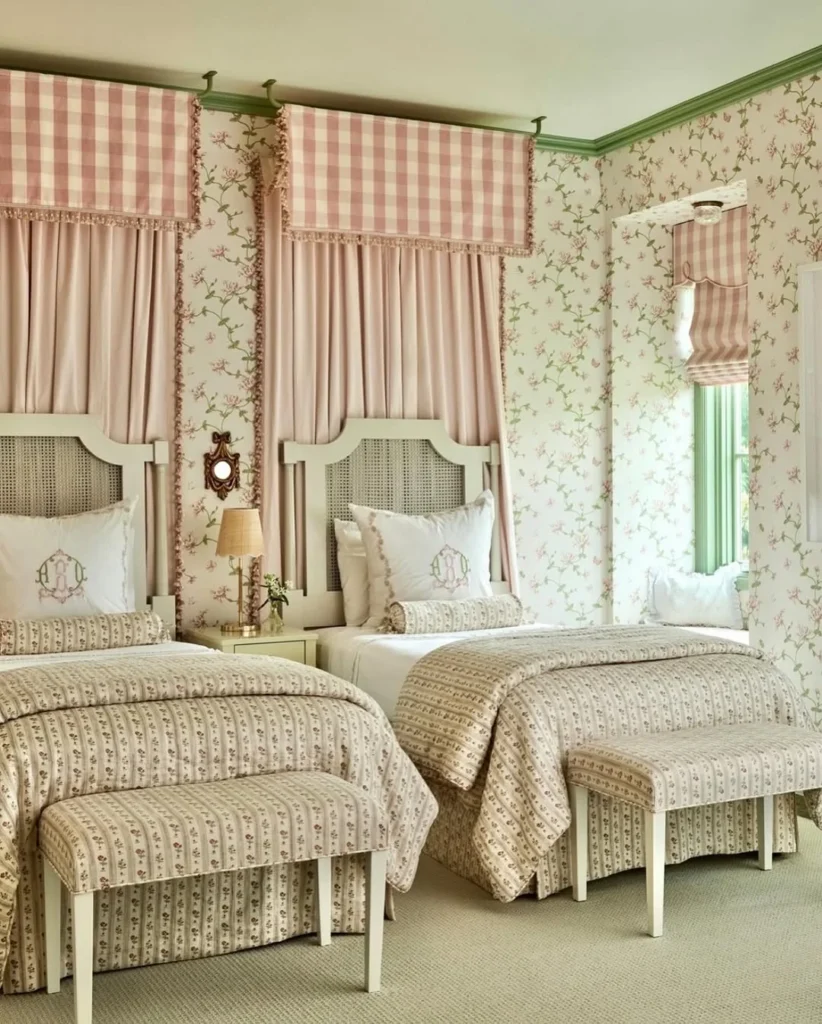 Layered bedding adds depth without overpowering the design, blending subtle prints with neutral shades for a timeless look. Upholstered benches at the foot of each bed provide both function and charm, offering a place to sit or set down essentials.
