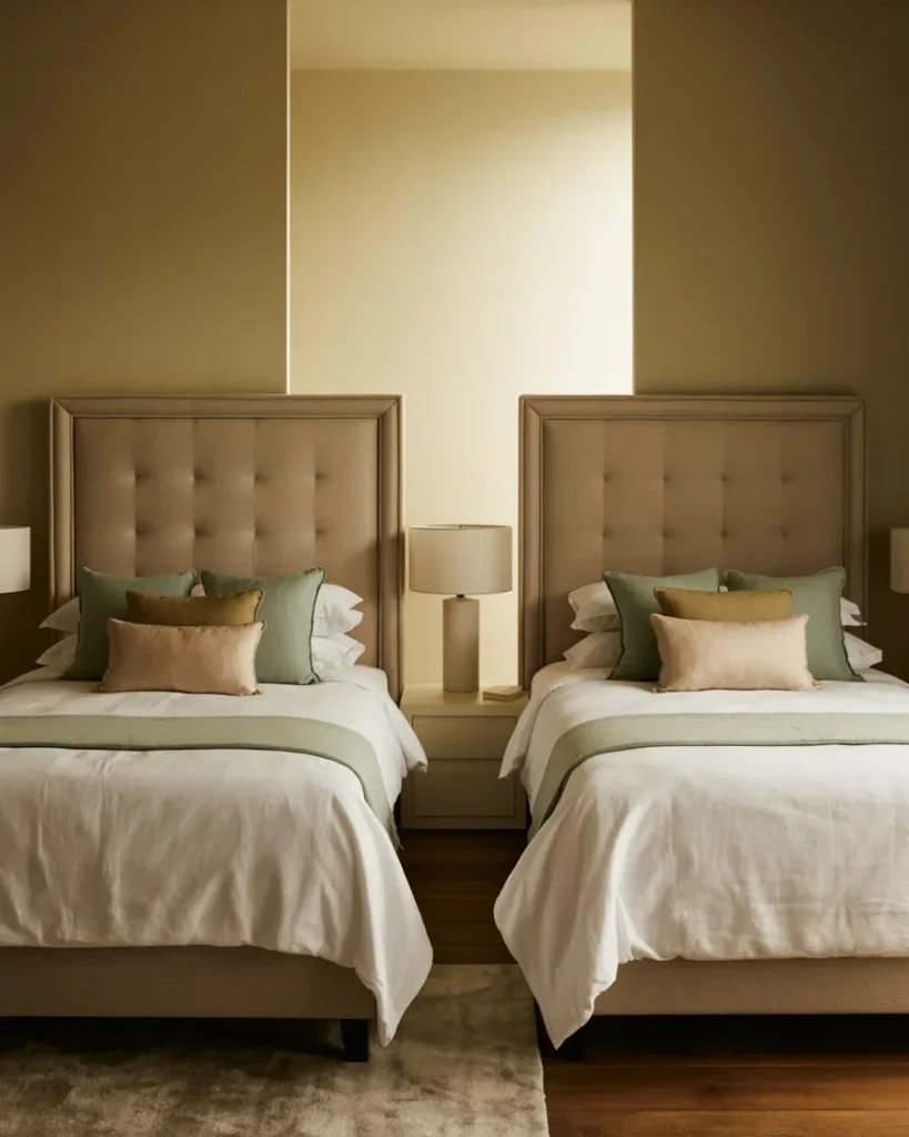 Thoughtful symmetry brings balance to the room, with matching lamps, headboards, and layered bedding creating visual order. Warm green tones mixed with neutral walls help the space feel grounded without looking heavy.