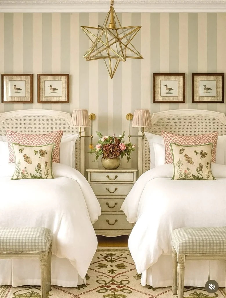 This twin beds guest room idea feels calm and welcoming through balanced design and gentle color choices. Soft striped walls create height and elegance while keeping the room light and open for guests.