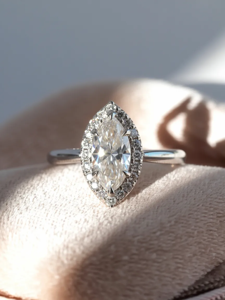 This stunning marquise engagement ring features a dazzling diamond at its center, surrounded by a delicate halo of smaller diamonds.