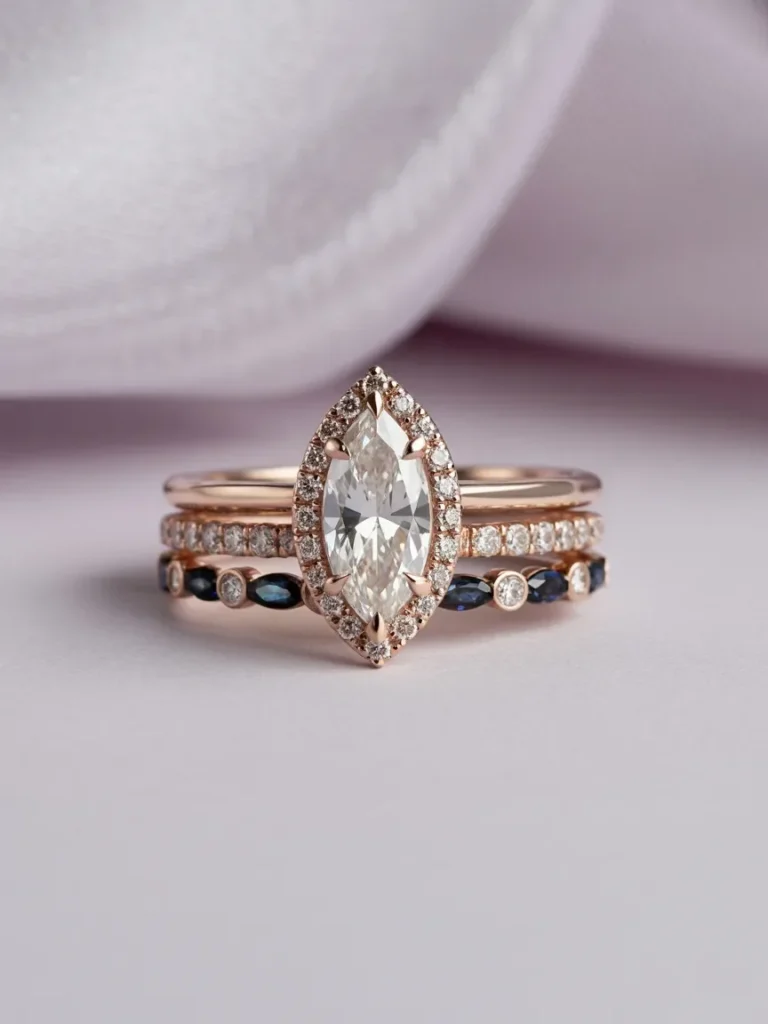 This stunning marquise diamond is the centerpiece of a delicate rose gold band adorned with smaller diamonds. The elongated marquise shape enhances the finger’s appearance, creating an elegant and modern feel.