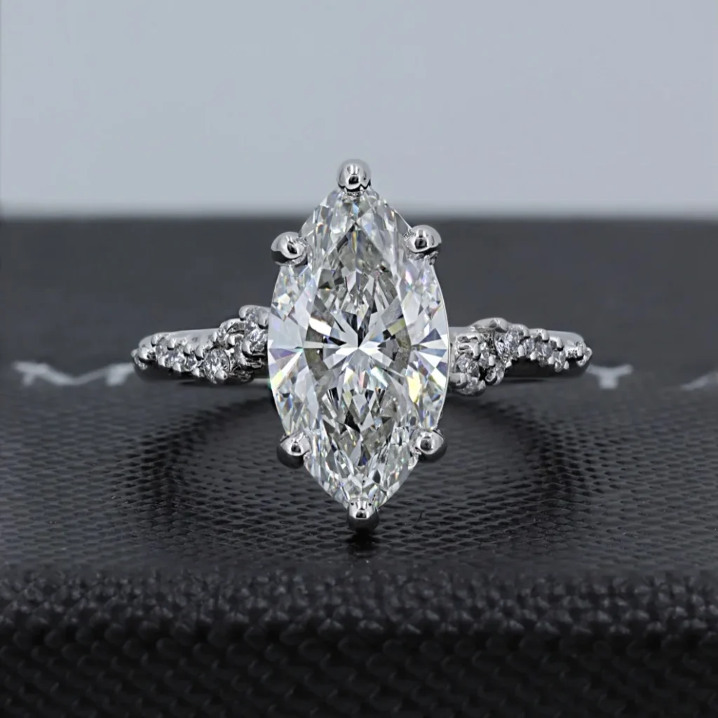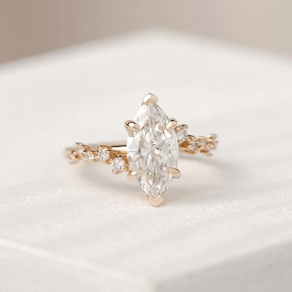 The band is adorned with delicate round diamonds, adding a subtle sparkle that perfectly complements the striking marquise cut.