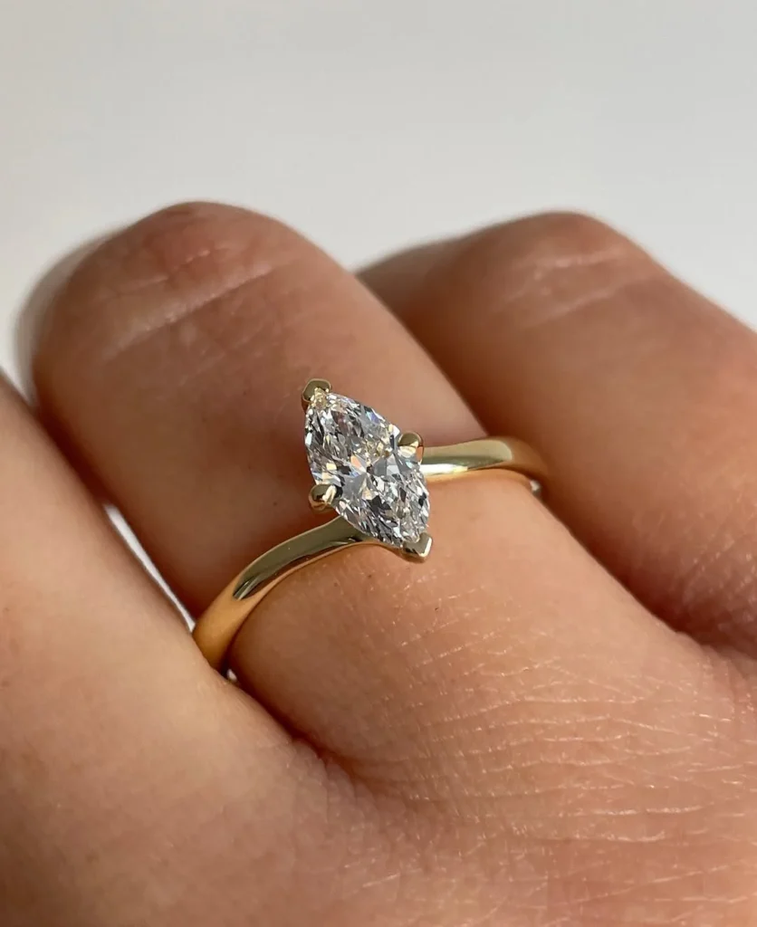 The simple, sleek band allows the marquise diamond to take center stage, while the warm hue of yellow gold gives the design a timeless, vintage feel.