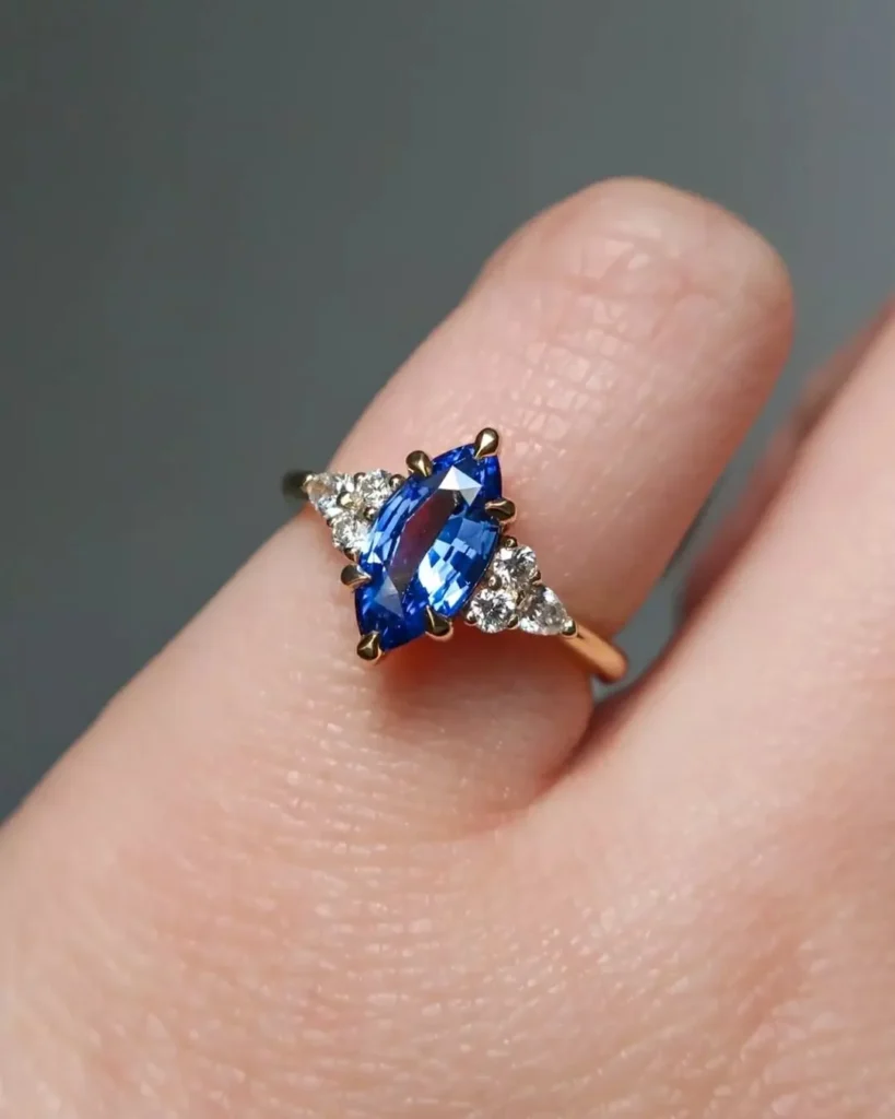The sharp edges of the marquise cut provide a striking contrast with the round diamonds, while the deep blue sapphires add a touch of color. The rose gold setting complements the overall design, creating a warm and elegant feel.