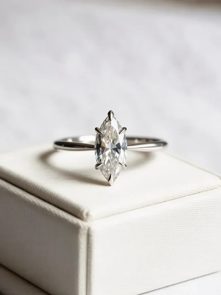 The marquise cut elongates the finger, adding a sophisticated, vintage feel to the design. The white gold band complements the diamond’s sparkle, enhancing its radiance without overpowering it.