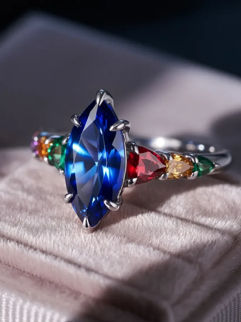 This striking marquise engagement ring features a stunning blue gemstone as the center stone, flanked by a gradient of colorful gemstones in vibrant hues.