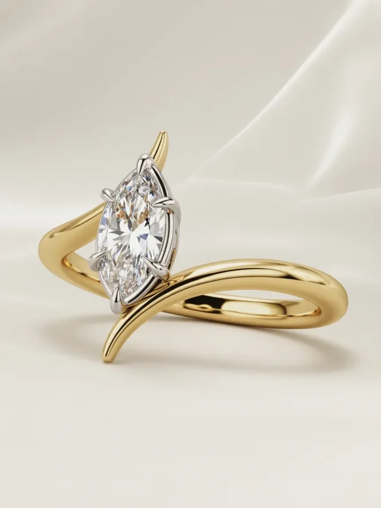 This striking marquise diamond is set atop a sleek, twisting band that contrasts beautifully with the traditional diamond shape.