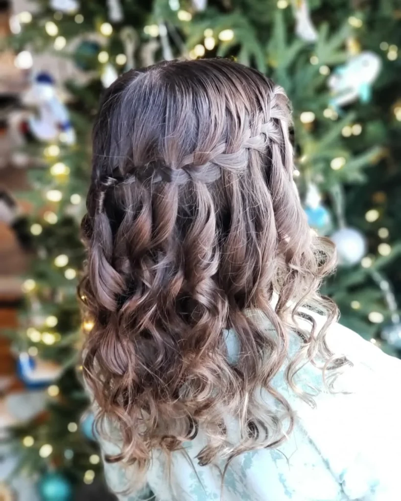 This playful and romantic hairstyle features a half-up braided design paired with loose, cascading curls. The braids beautifully frame the face while the curls add volume and texture, creating a soft and elegant look. Perfect for casual holiday events, parties, or relaxed family gatherings, this style combines fun and sophistication effortlessly.
